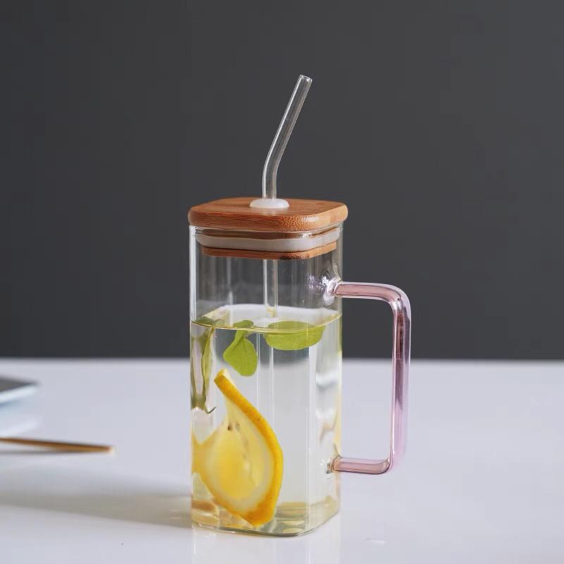كوب زجاج مربع مع مسكة - غطاء خشب + مصاصة زجاج AZ-1193
