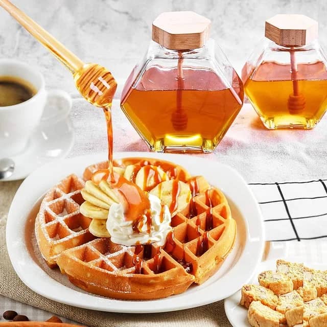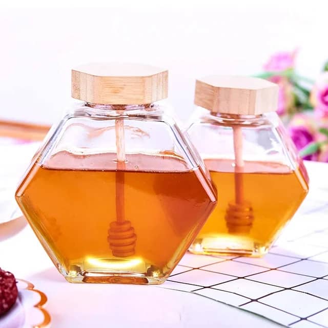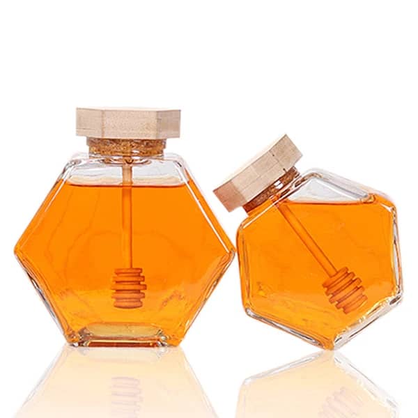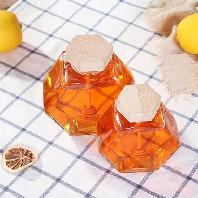 علبة عسل زجاج خلية غطاء وملعقة خشب