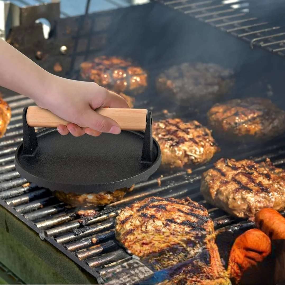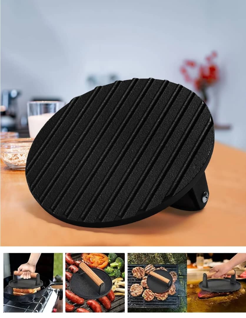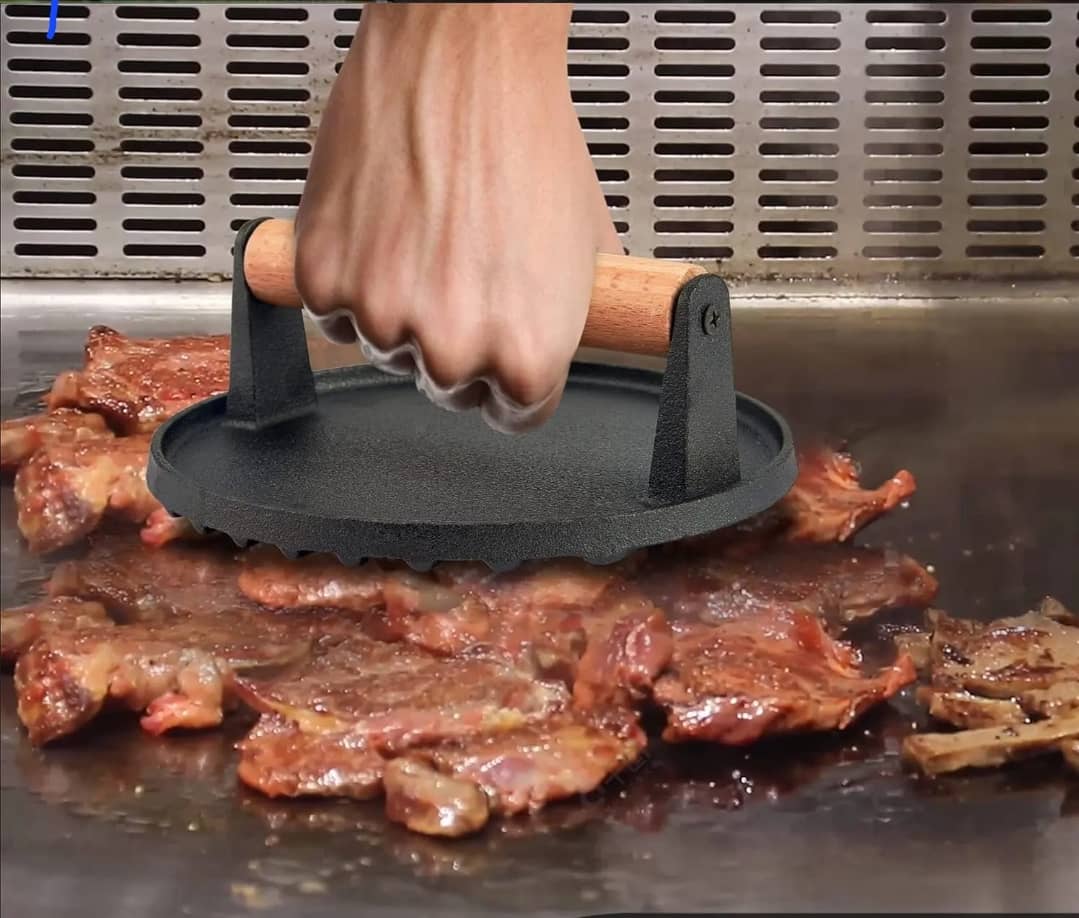 يمكن استخدام مكبس الشواء المصنوعة من الحديد للطهي، وهي مناسبة للشواء في الهواء الطلق، ويمكن وضعها فوق اللحوم أو البرغر أو شرائح اللحم. تعمل المكبس على توزيع الحرارة بالتساوي، مما يساعد على طهي الطعام بشكل مثالي. بفضل وزنها الدائري، تتناسب مكيس شرائح اللحم مع معظم أسطح الطهي.
