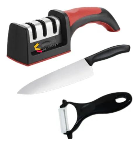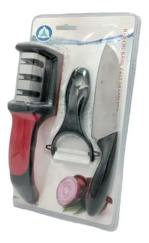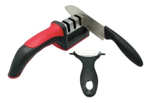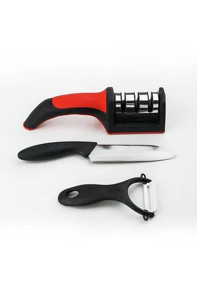 طقم أدوات مطبخ مميز يضم مِسَن سكاكين، سكين حاد، وقشارة، مصمم لتوفير كل ما تحتاجه لتحضير الطعام بسهولة ودقة في مكان واحد.