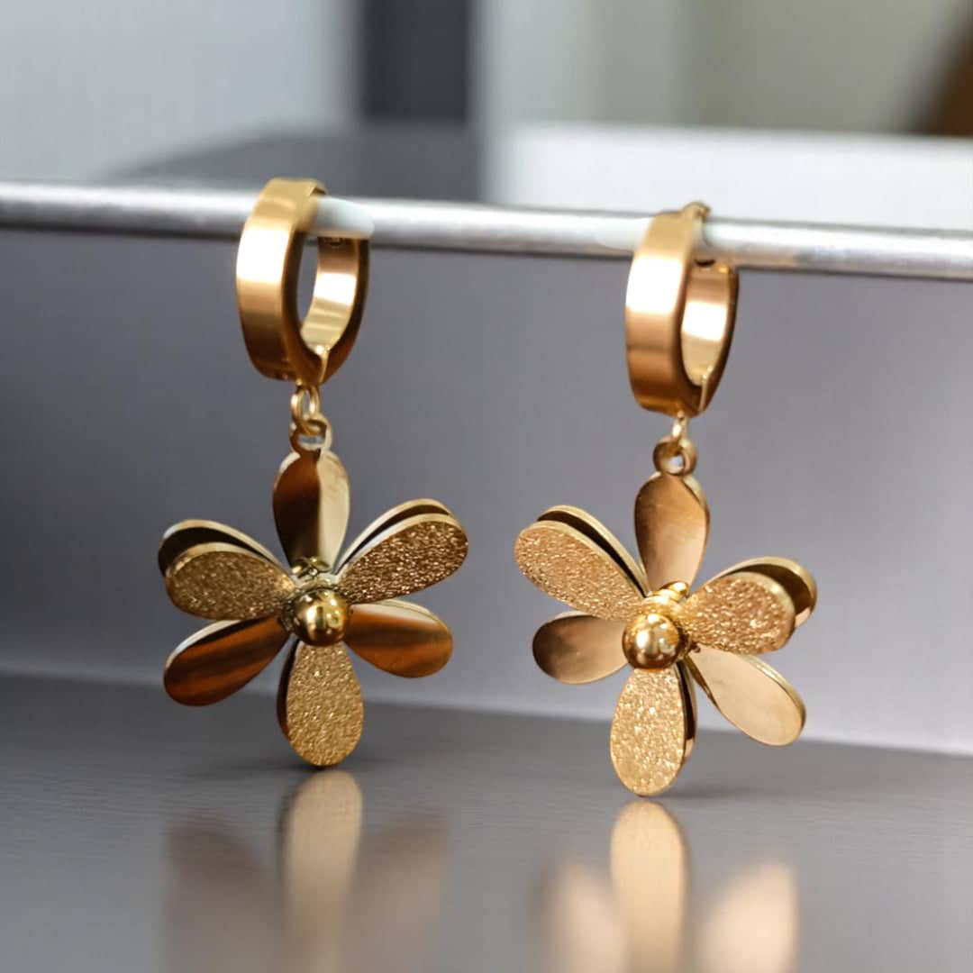 أخراص ناعمة بتصميم وردة أنيقة، مصنوعة من الستانلس ستيل الذهبي، تضيف لمسة من الرقي والأنوثة لكل إطلالة، وتناسب الاستخدام اليومي أو المناسبات الخاصة.