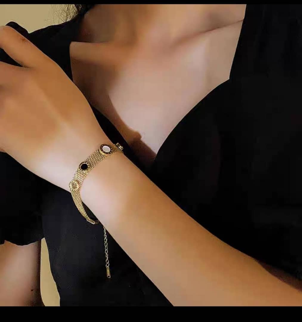 إسورة فاخرة مصنوعة من الستانلس ستيل الذهبي، مزينة بتفاصيل دوائر بتصميم رخامي ناعم، تجمع بين البساطة والفخامة لتضفي لمسة راقية على معصمك