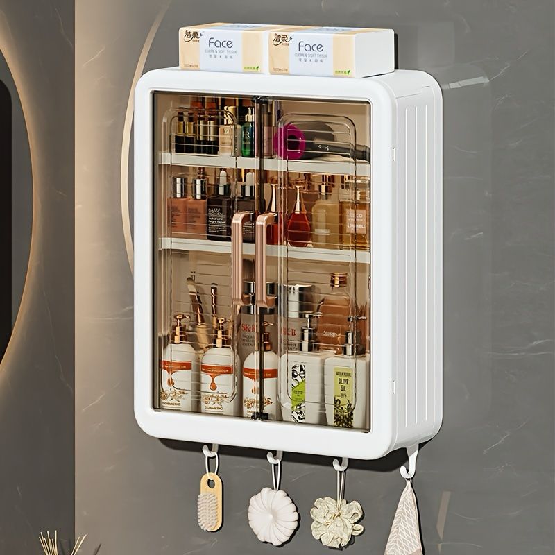 ستاند أنيق لتنظيم أدوات الحمام والإكسسوارات – لمسة فخامة في كل زاوية ستاند عصري بتصميم راقٍ يمنح حمامك لمسة من الأناقة والتنظيم. مصنوع من مواد عالية الجودة مع أبواب شفافة تضيف لمسة فاخرة وتحمي المحتويات من الغبار والرطوبة