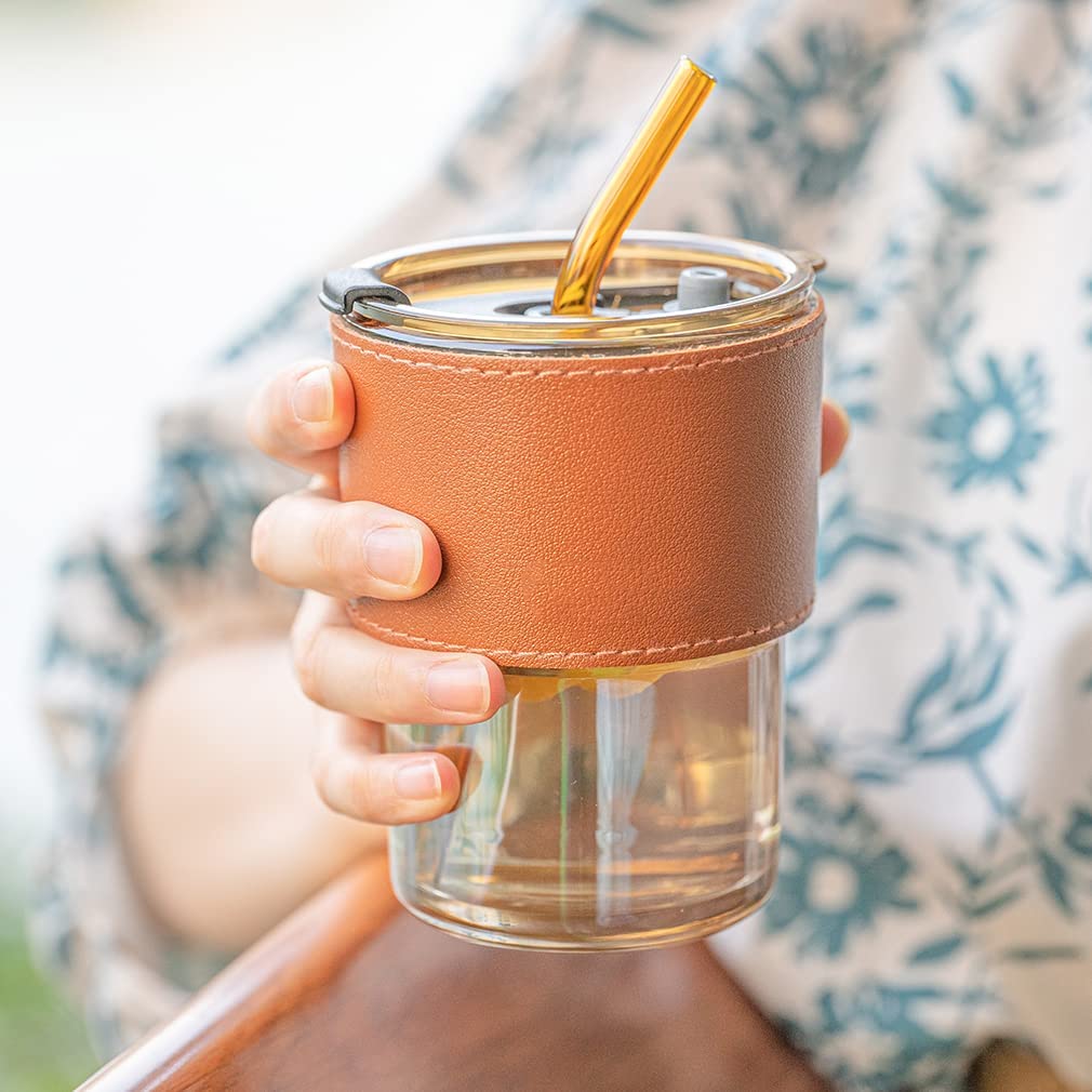 كوب زجاج فاخر مع مصاصة 400 مل ملبس جلد AZ-3227