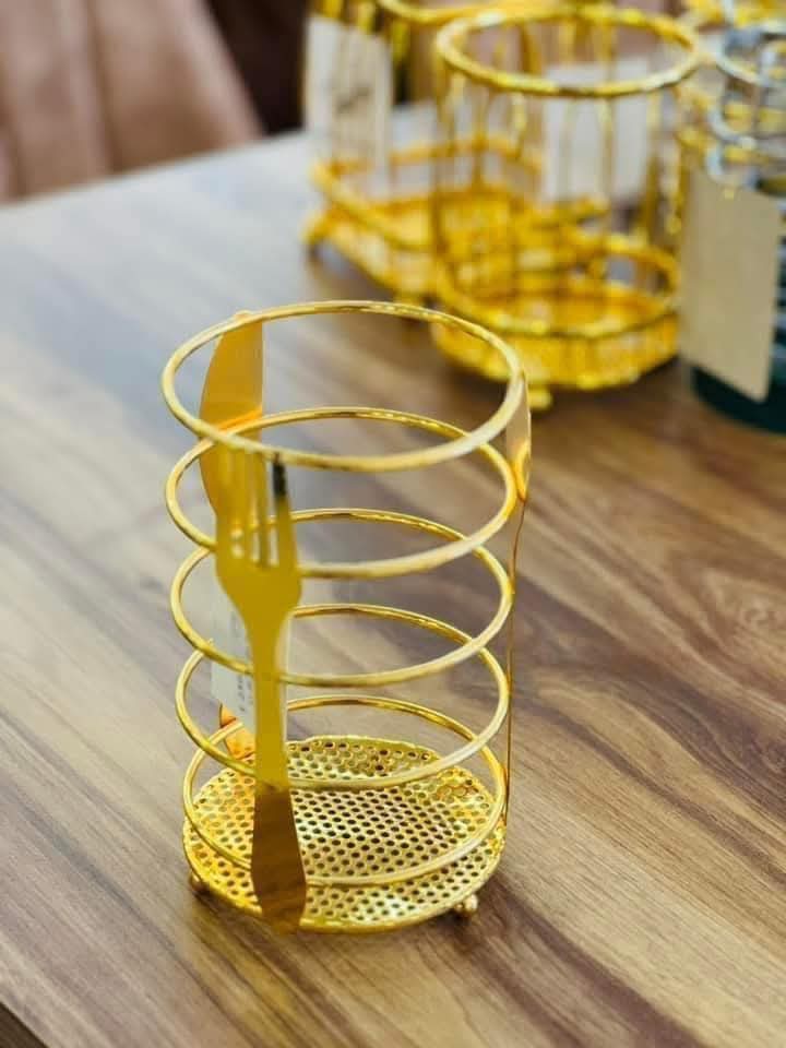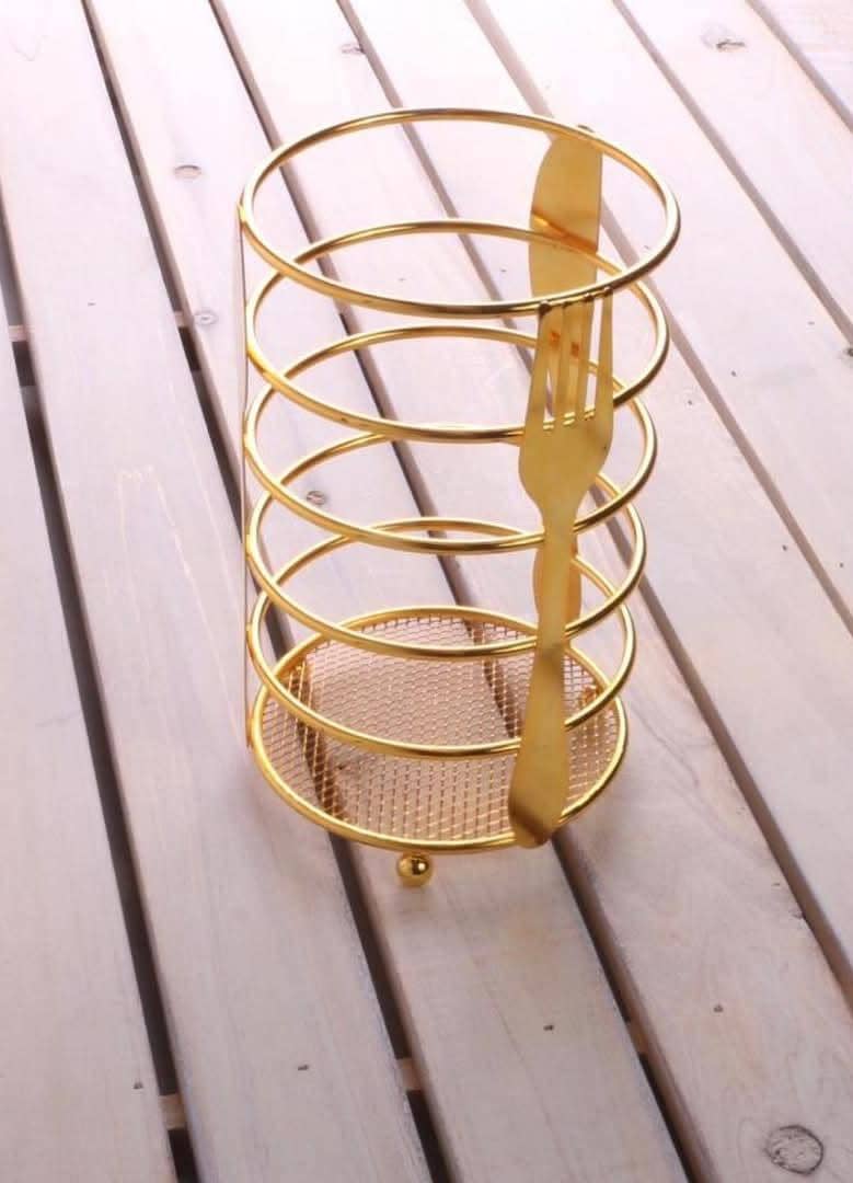 أضف لمسة من الأناقة والفخامة إلى مطبخك مع سلة الملاعق المصنوعة من الستانلس ستيل باللون الذهبي. تصميم دائري أنيق يضفي طابعًا عصريًا على طاولتك أو سطح المطبخ، مع فتحات تهوية تضمن بقاء الأدوات جافة ونظيفة. مثالية لحفظ الملاعق، الشوك، والسكاكين بشكل منظم وراقي.