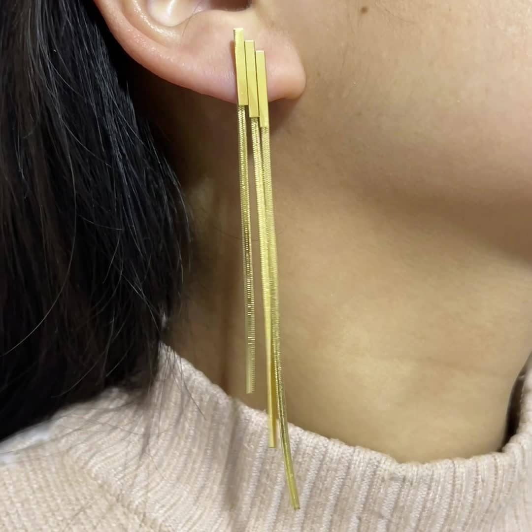أخراص أنيقة بتصميم طويل وانسيابي، مصنوعة من الستانلس ستيل الذهبي بلمسة لامعة جذابة تضيف تألقًا مميزًا لأي إطلالة، مثالية للمناسبات أو اللمسات اليومية الراقية.