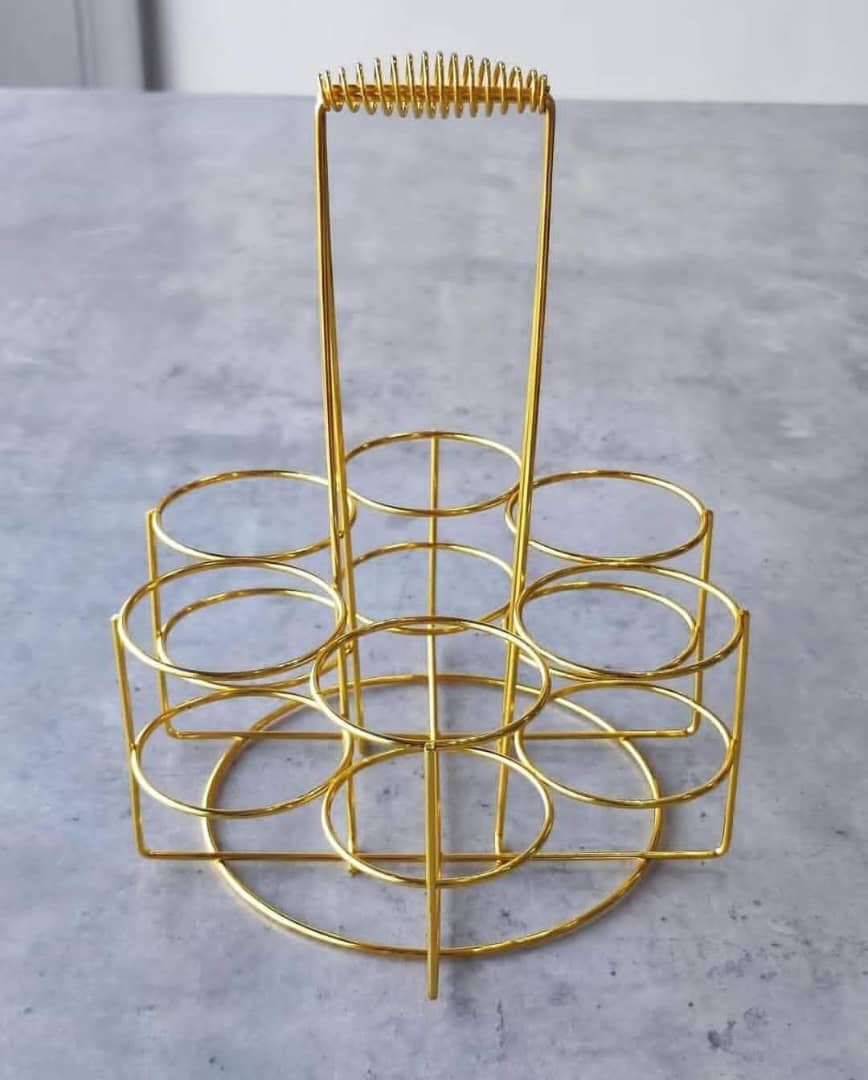 ستاند أنيق مصنوع من الستيل المتين المطلي باللون الذهبي اللامع، مصمم بشكل عملي ليحمل 6 قلاصات بترتيب منظم. يتميز بلمعانه العصري وشكله الراقي الذي يضفي لمسة فخامة على المطبخ أو طاولة الضيافة. سهل الاستخدام والتنظيف، ويجمع بين الأناقة والعملية في تقديم الأكواب وحفظها بشكل مرتب.