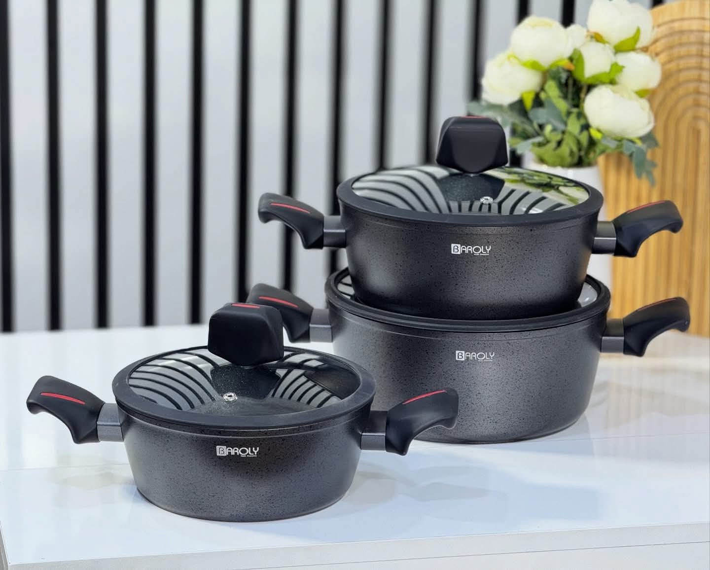 طقم أواني طهي من ماركة بارولي، والذي يتميز بتصميم عصري يجمع بين الأناقة والعملية.