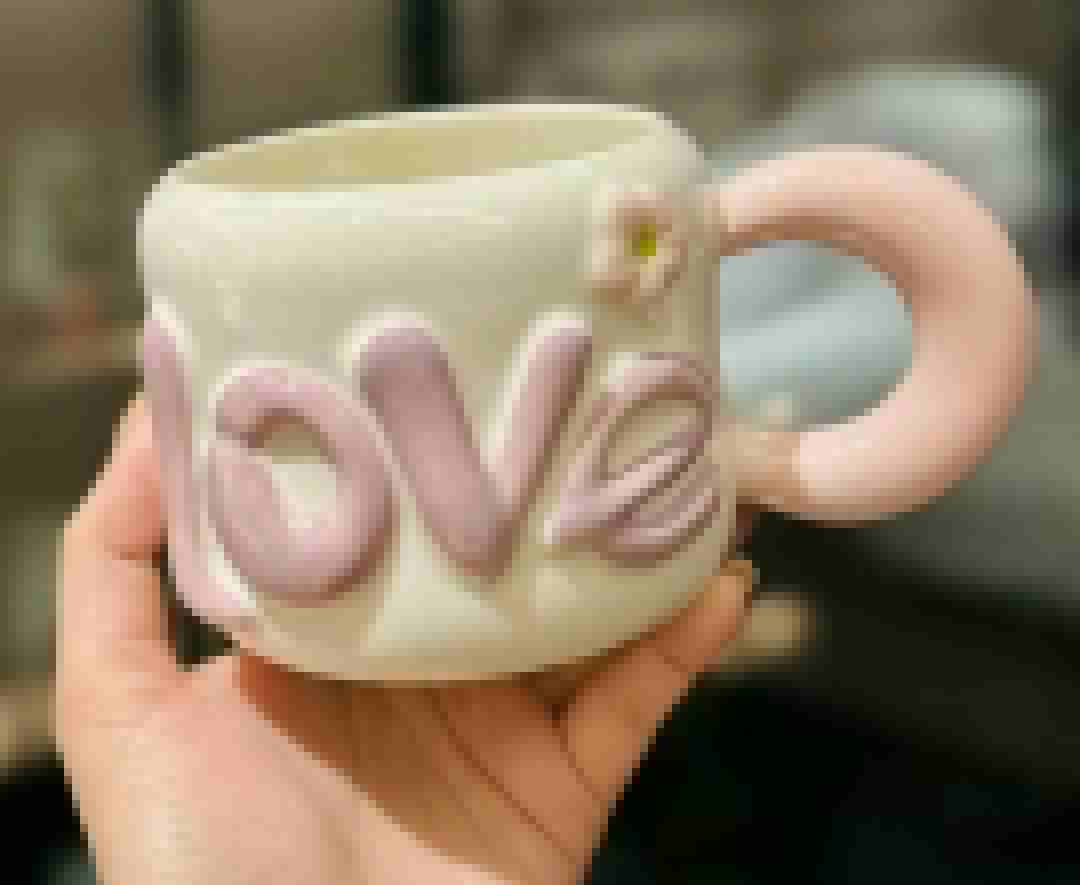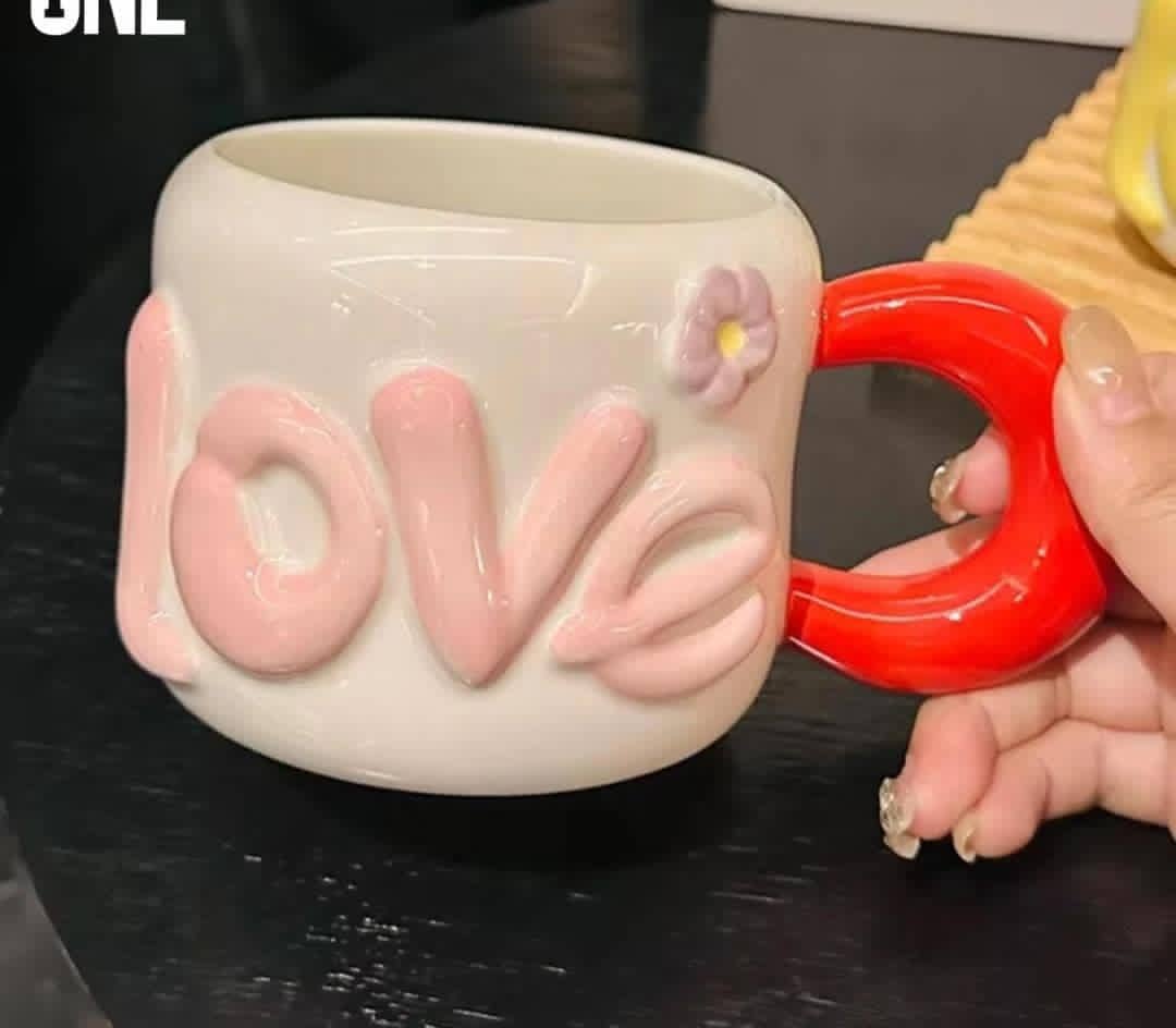 كوب أنيق مصنوع من السيراميك الأبيض الفاخر بوزن ثقيل يمنحه ثباتًا ومتانة عالية، مزين بكلمة LOVE بتصميم مميز يضفي لمسة رومانسية على استخدامه اليومي. مثالي لتقديم القهوة أو الشاي بأسلوب راقٍ، ويعد اختيارًا رائعًا كهدية مليئة بالمحبة والذوق الرفيع.