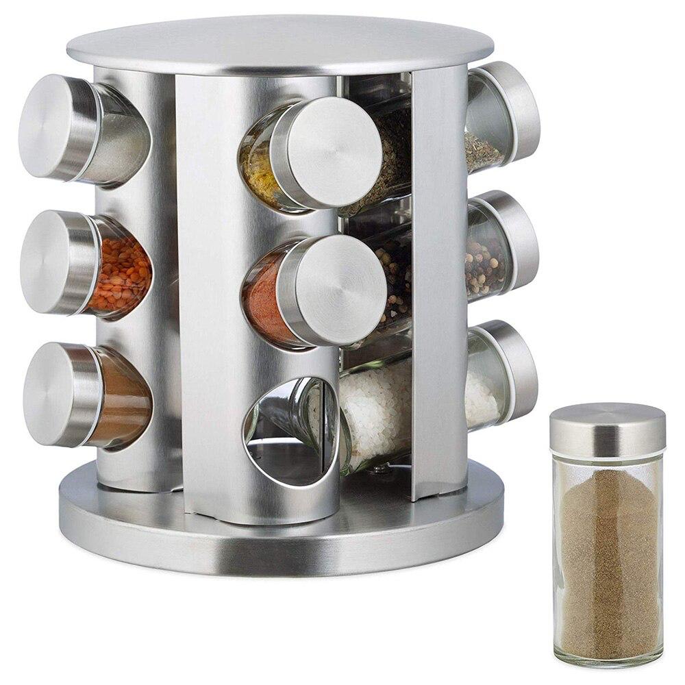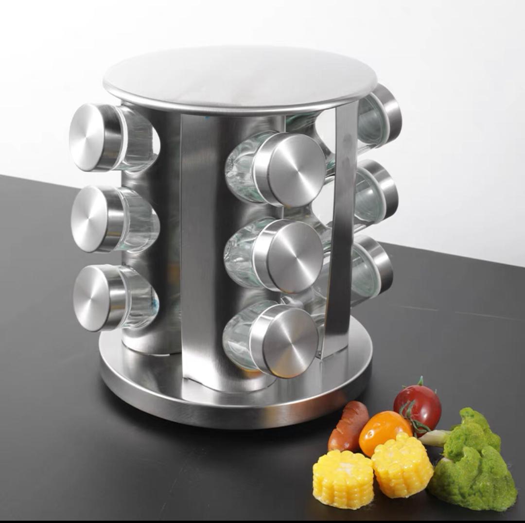 يحتوي على 12 برطمانًا صغيرًا مصنوعًا من الزجاج الشفاف مع أغطية من الفولاذ المقاوم للصدأ، مما يتيح رؤية التوابل بداخلها بسهولة.